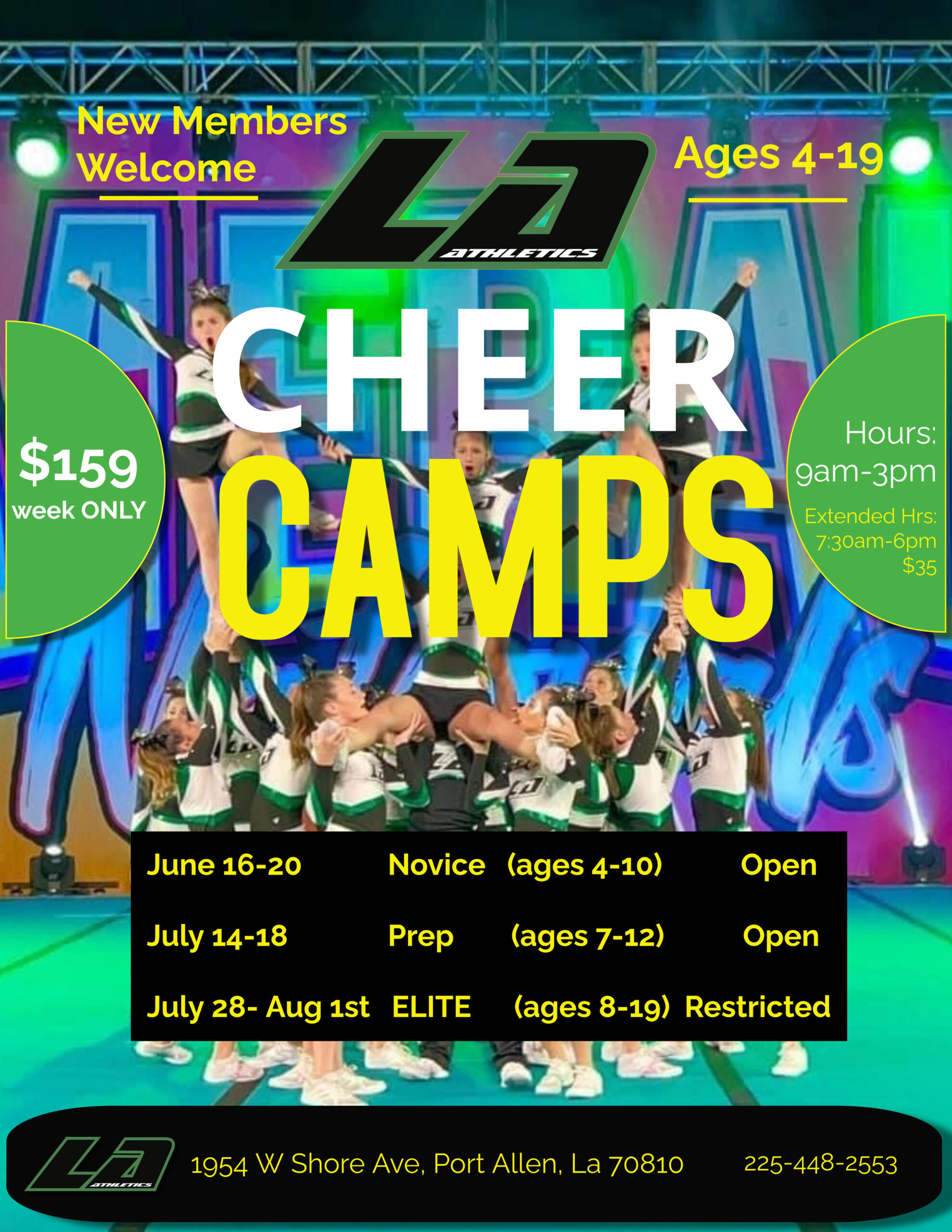 Cheer Camp is an energetic summer camp where kids learn the fundamentals of cheerleading, including stunts, jumps, cheers, and dance routines, all while building teamwork, confidence, and school spirit in a fun and supportive environment. Date: July 28th - August 1st Time: 9 am - 3 pm Ages: 8 - 19 (Restricted to Elite Team...